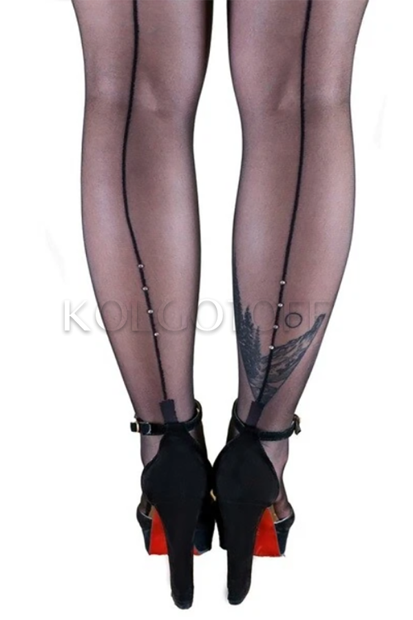 Элегантные матовые полупрозрачные чулки плотностью 20 Den с имитацией шва сзади декорированные стразами. Кружевная резинка на силиконовой основе шириной 8 см, уплотнённая стопа, пирамидальная пятка. Укреплённые мыски.