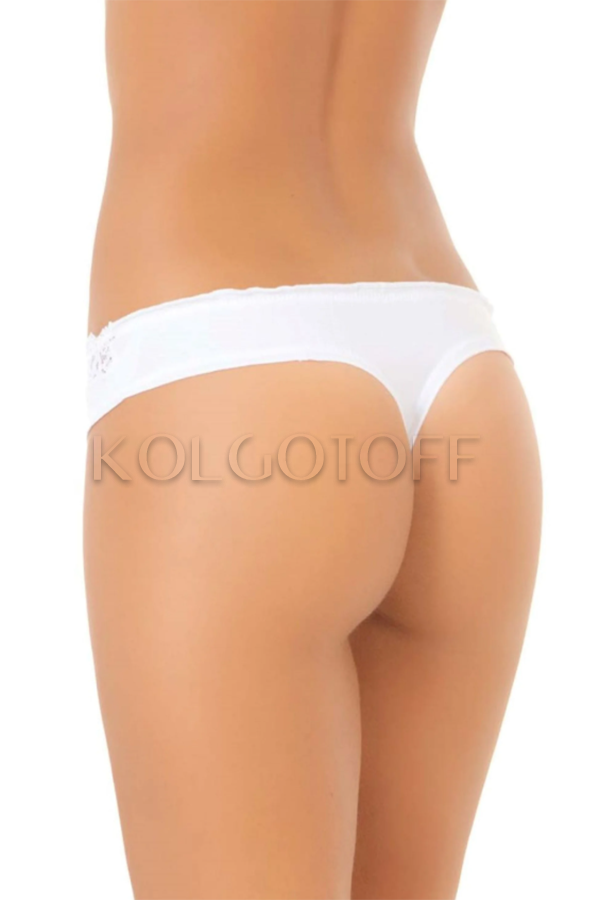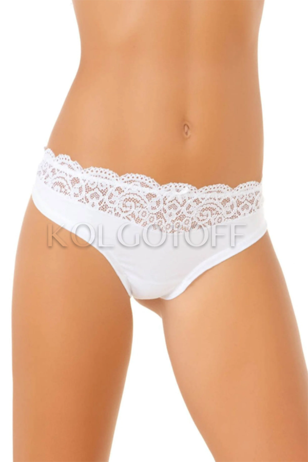 Классические трусики-стринги из хлопка и модала с заниженной талией. Спереди пояс украшает вставка полупрозрачного кружева и миниатюрный бантик. Края трусиков волнистые, хлопковая ластовица.