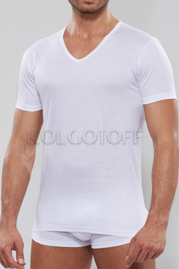 Чоловіча однотонна футболка класичного крою, з короткими рукавами і V-подібним вирізом. Без бічних швів. 100% бавовна.