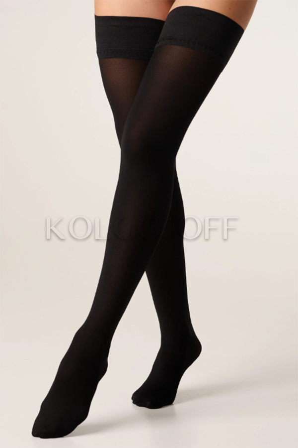 Щільні матові панчохи з мікрофібри щільністю 60 Den з гладкою гумкою (без декору) на силіконовій основі шириною 8 см. Невидимі миски.