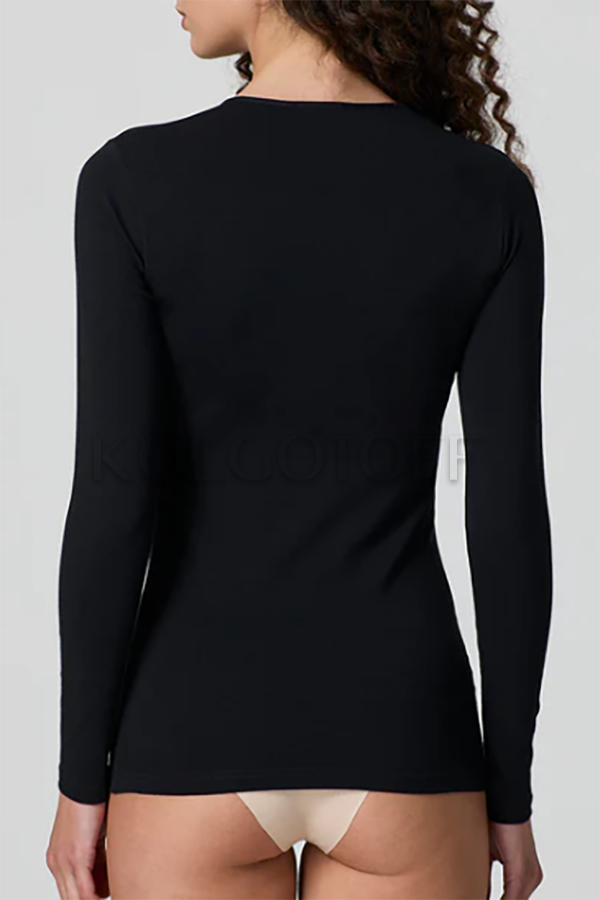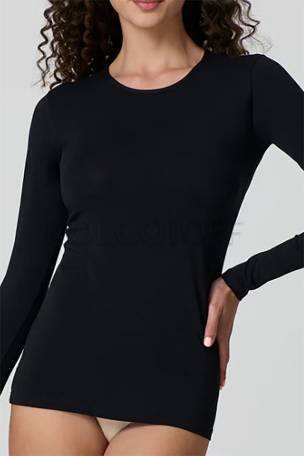 Жіноча футболка з невеликим вирізом і довгим рукавом. Виготовлена з високоякісного бавовни. Еластична, після прання не змінює форму.