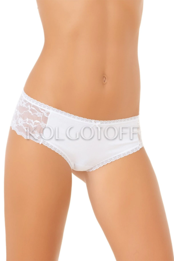 Нежные трусики-слип из хлопка и модала с заниженной талией. Кружевные вставки по бокам, задняя деталь полностью кружевная. Отделаны ажурной тесьмой, украшены бантиком. Хлопковая ластовица.